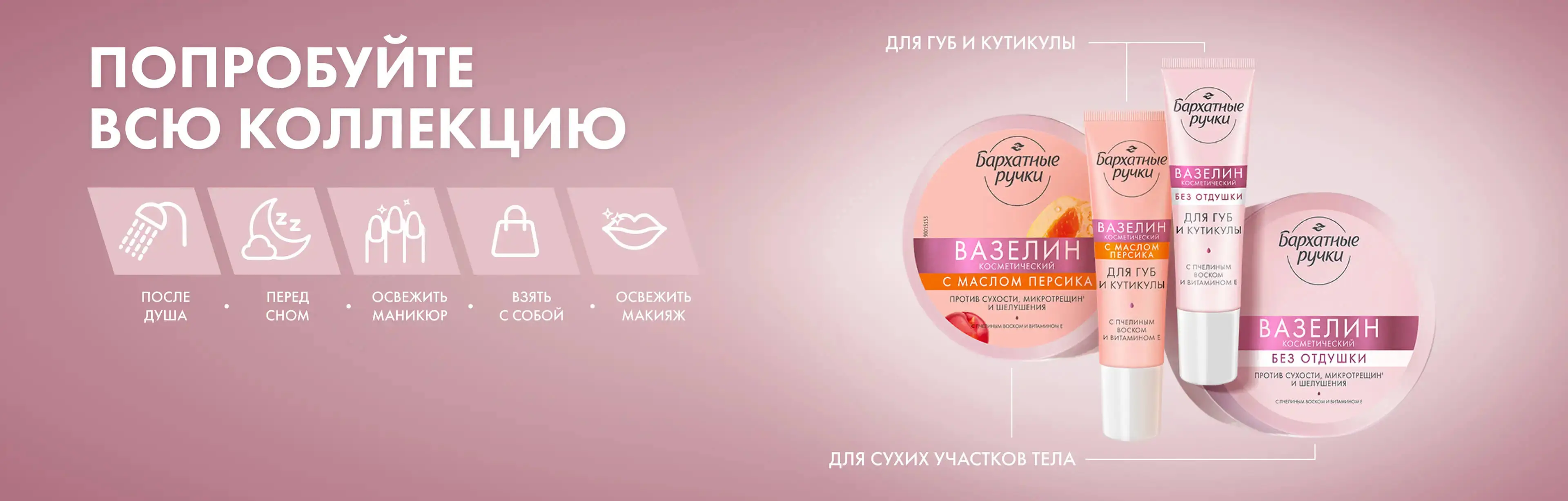 Косметический вазелин для ухода за кожей рук и ног, для локтей и пяток Бархатные Ручки — это универсальное средство, разработанное специально для активного питания и восстановления очень сухой и обезвоженной кожи. Средство создает надежный защитный барьер, который эффективно оберегает кожу от воздействия холода, мороза и ветра. А также предотвращает появление сухости, микротрещин и шелушений.